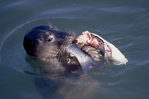 This male seal is eating fish because that's its main source of food The grey seal mainly eats fish. They also eat squid, octopus, crabs, other crustaceanscrustaceans and sand eels. To get their food they hunt in open waters, but if a sea bird gets too close the seal will get a nice fresh sea bird dinn-dinns. They use their claws to rip up prey. Grey seals usually hunt alone.